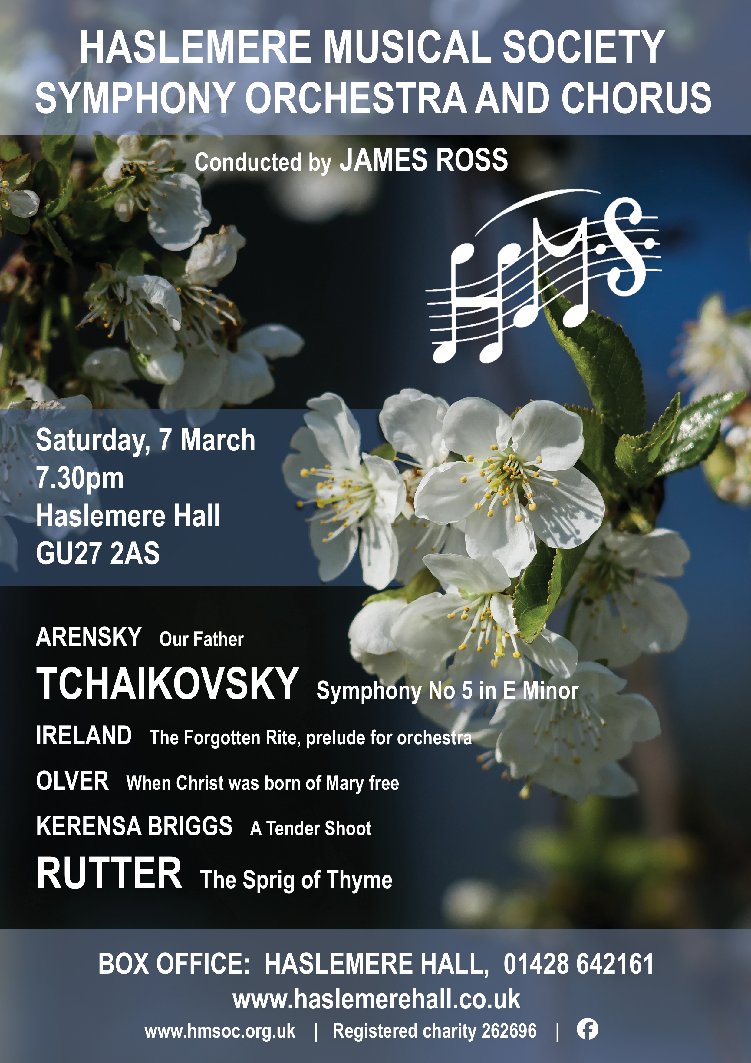 The Haslemere Musical Society's March concert is designed to herald Spring. The orchestra will be playing the well-loved Symphony No. 5 in E minor by Tchaikovsky and the choir will sing Rutter's collection of songs entitled The Sprig of Thyme.